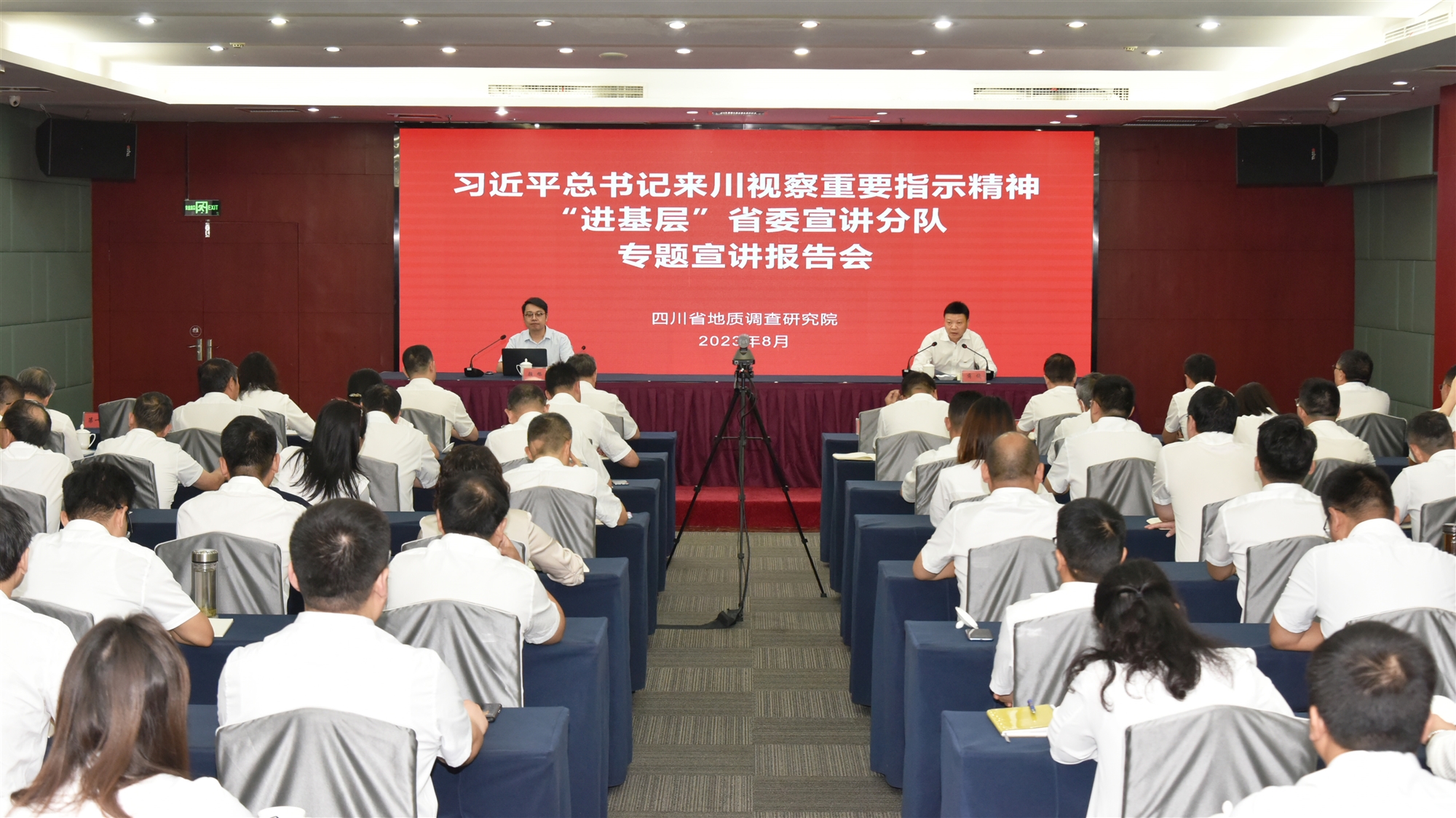 8月28日,习近平总书记来川视察重要指示精神“进基层”省委宣讲分队走进省地调院。省委省直机关宣讲分队成员、四川省社会主义学院党组成员、副院长颜旭对习近平总书记来川视察重要指示精神进行系统宣讲和深刻解读。党委书记、院长蒋俊主持会议并讲话。