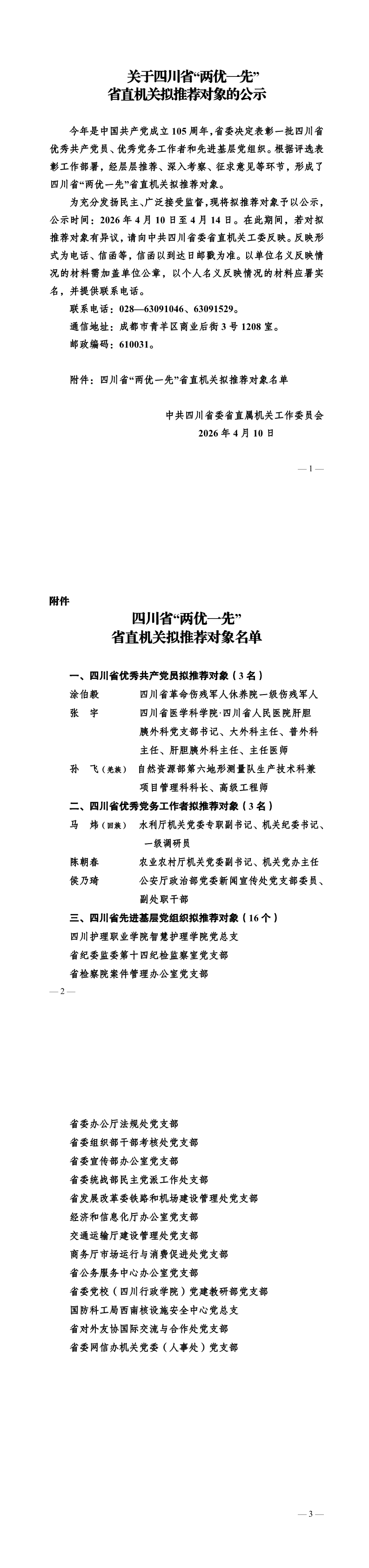 关于四川省“两优一先”省直机关拟推荐对象的公示