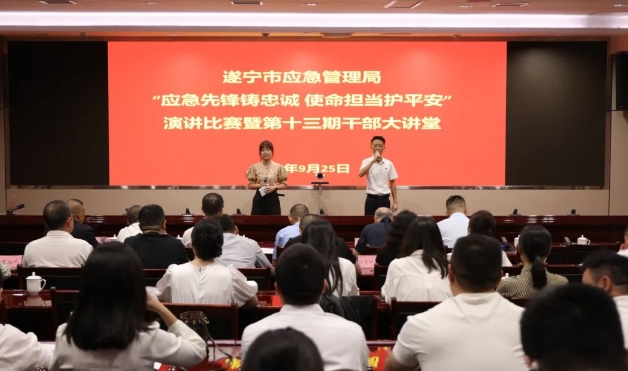 9 月 25 日,遂宁市应急管理局举办 “应急先锋铸忠诚 使命担当护平安” 演讲比赛决赛暨第十三期干部大讲堂,16 名经初赛选拔的选手同台竞技,展现应急队伍的初心与担当。