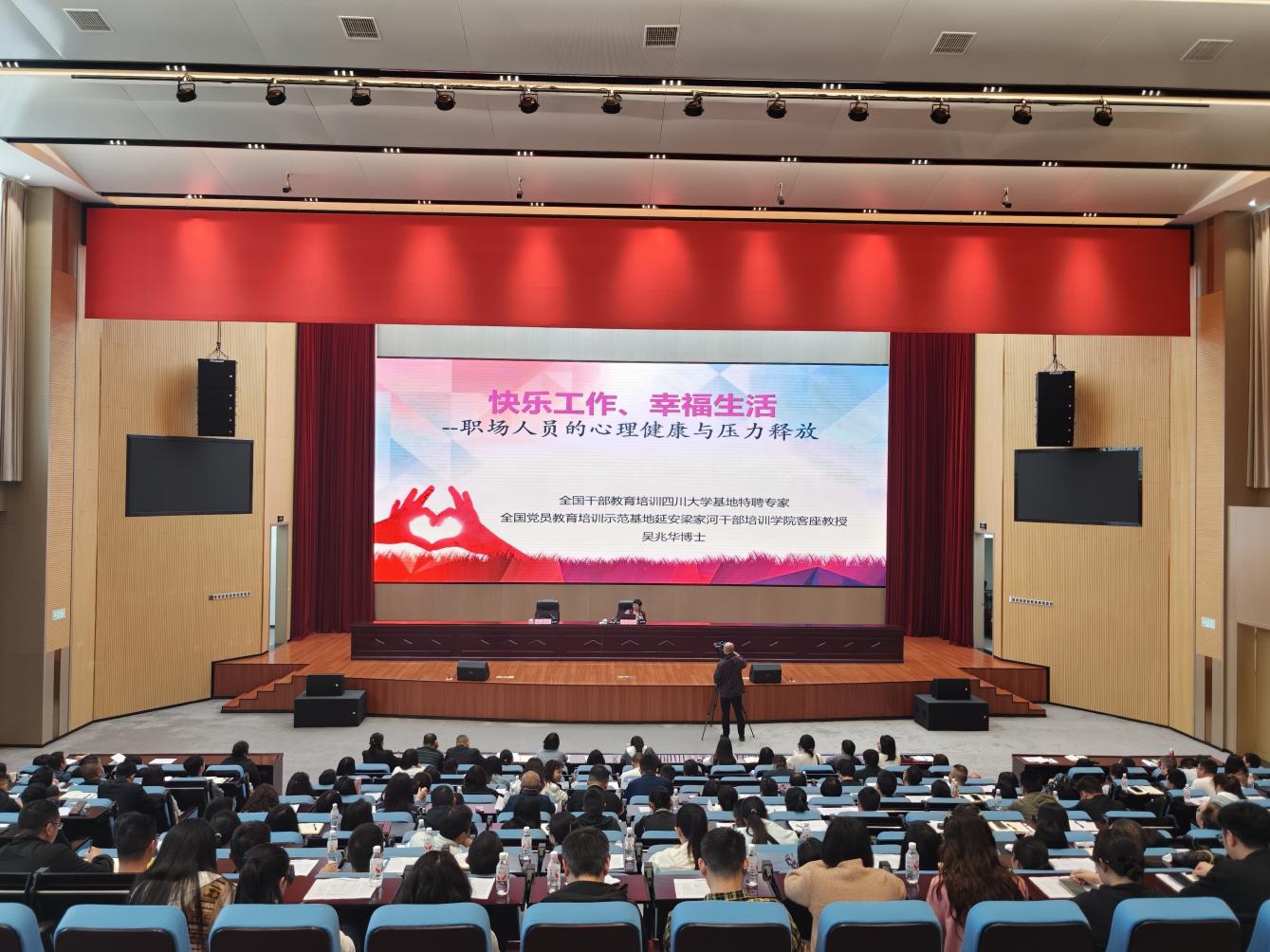 4月16日,隆昌市2026年第一期机关大讲堂开讲。本期大讲堂以“职场人员的心理健康与压力调适”为主题,旨在深入学习贯彻习近平总书记关于“培育自尊自信、理性平和、积极向上的社会心态”的重要论述,推动建设身心健康、充满活力的机关党员干部队伍。市直各部门机关党委书记、机关纪委书记及部分下属党支部负责人等220余人参加学习。