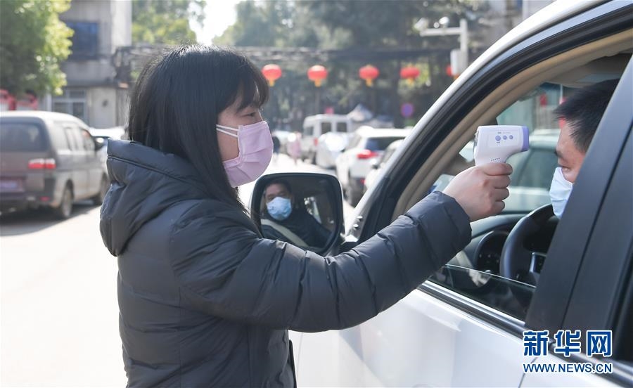 武汉市武昌区首义路街大东门社区对出入者进行体温检测排查(2月9日摄)。新华社记者 程敏 摄