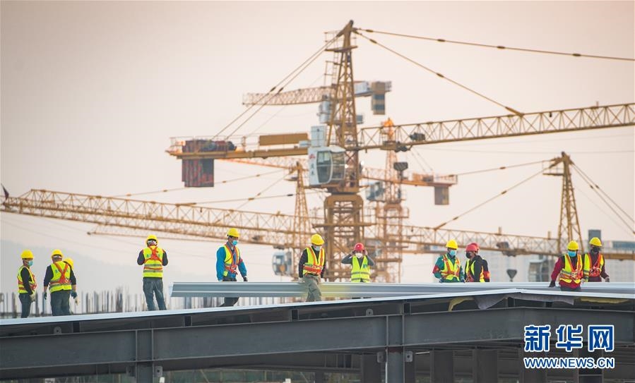 中建三局的建设工人在武汉雷神山医院建设工地施工(2月4日摄)。新华社记者 肖艺九 摄