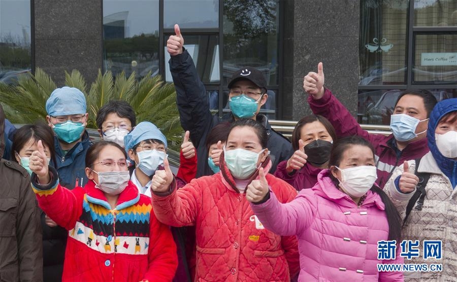 在武汉市协和医院西院区,康复出院的新冠肺炎重症患者与医护人员合影留念(2月19日摄)。新华社记者 才扬 摄