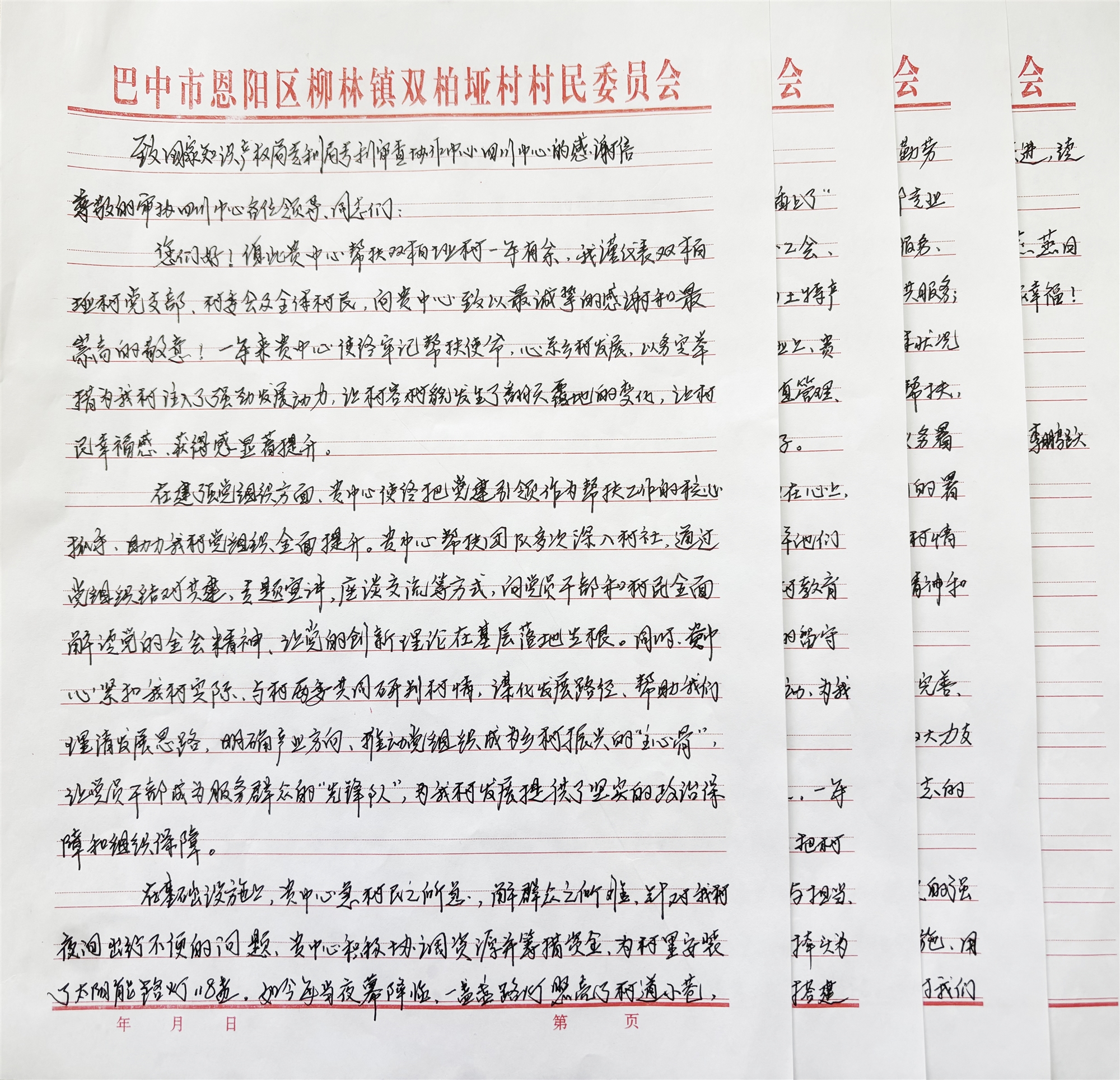 情暖寒冬,纸短情长。新年伊始,巴中市恩阳区柳林镇双柏垭村村支书代表全体村民,将一封饱含深情的手写感谢信送到审协四川中心,字里行间满是对中心定点帮扶工作的诚挚谢意,生动诠释了政企同心、共促振兴的深厚情谊。