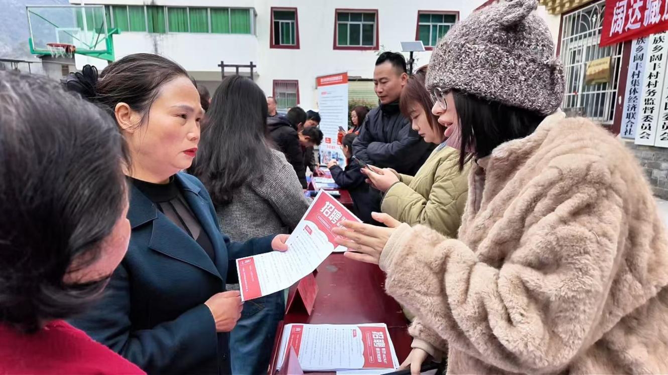 当天,一场新春助农专场招聘会在阔达藏族乡火热举行。此次活动是省工商联依托“万企兴万村”行动平台,积极动员会员企业履行社会责任的具体举措。在省工商联的精准对接下,西科餐饮管理集团有限公司、四川快住集成房屋有限公司两家企业携60个优质就业岗位来到现场,涵盖餐饮服务、技术工、销售等多个类别,为当地有就业意愿的群众搭建了便捷高效的对接平台。调研组深入活动现场,与求职群众亲切交流,询问就业意向与实际困难,鼓励大家一起为梦想奋斗、为幸福打拼。