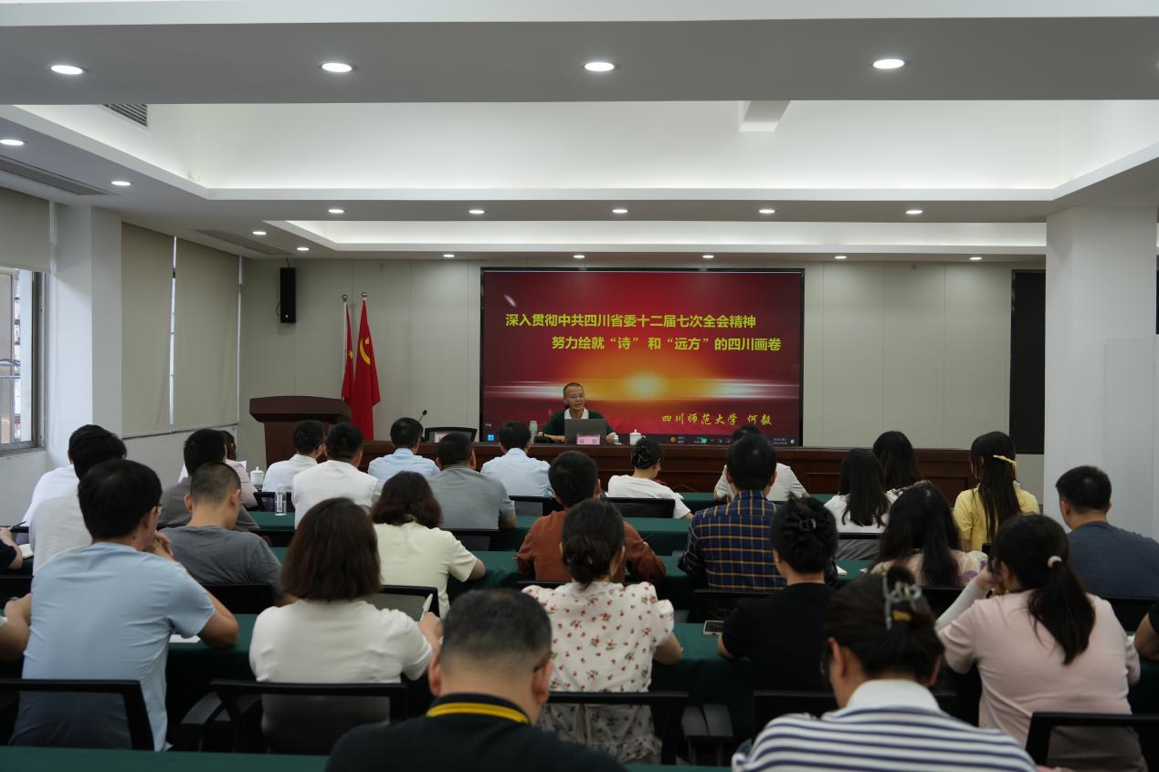 何毅教授以其深厚的理论素养和丰富的实践经验,紧扣省委十二届七次全会精神,从“认识全会背景与四川历史方位”“把握全会主题意义”“理解文旅深度融合内涵”等五方面,深入解读绘就四川“诗”和“远方”画卷的路径。围绕全会精神的核心要义、精神实质和实践要求,对全会精神作了全面宣讲和深入阐释,呈现一场内容丰富、见解深刻、阐释精辟的精彩辅导。